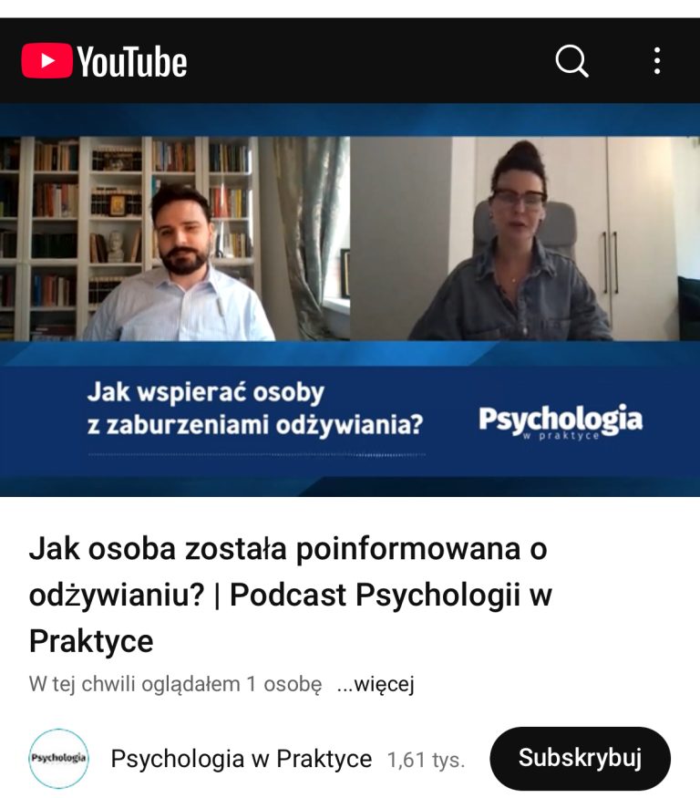 Podcast Psychologi w praktyce , w którym rozmawiamy o tym jak psychologowie i psychoterapeuci mogą skutecznie towarzyszyć osobom zmagającym się z zaburzeniami odżywiania. Nasza rozmowa